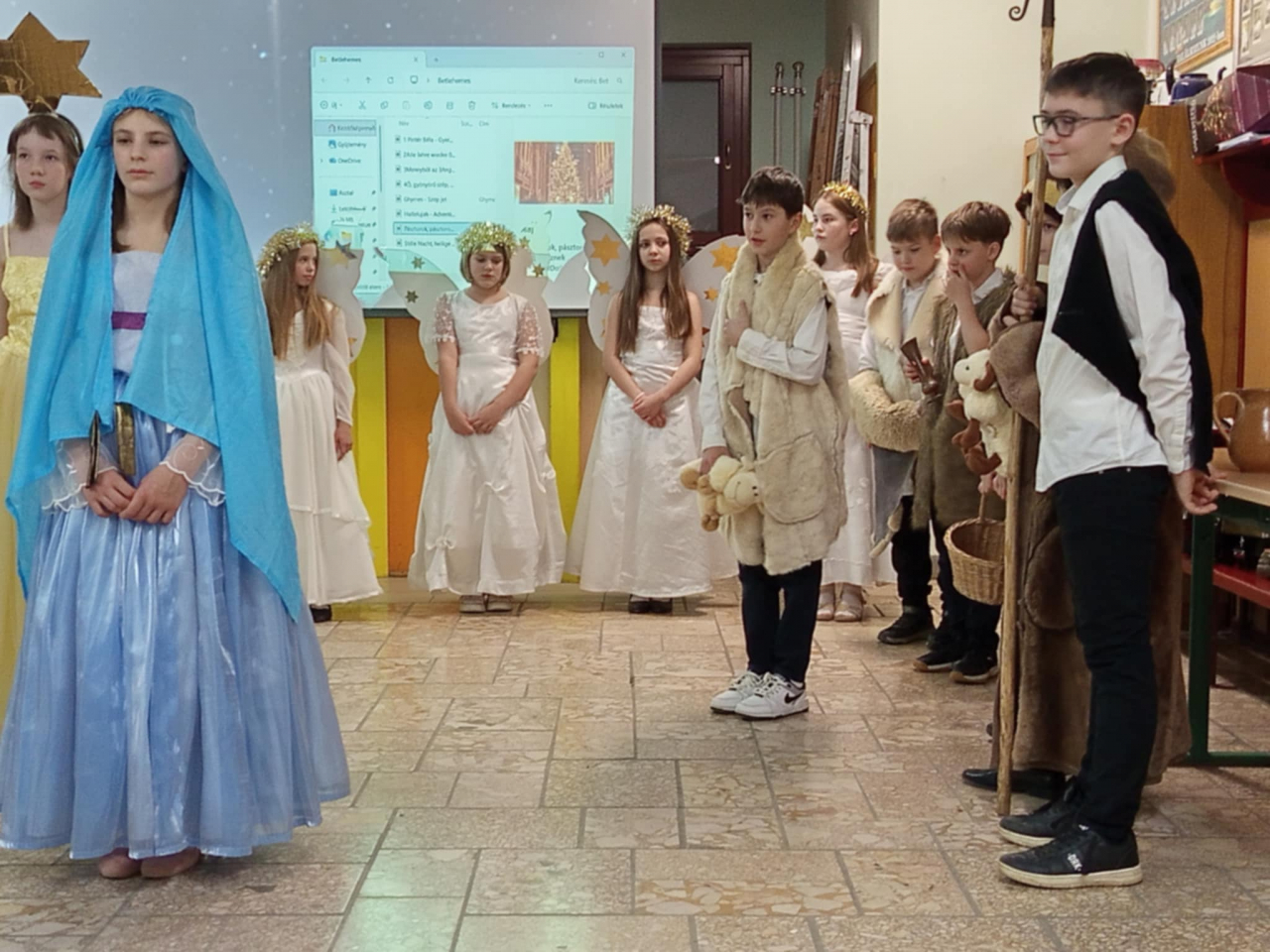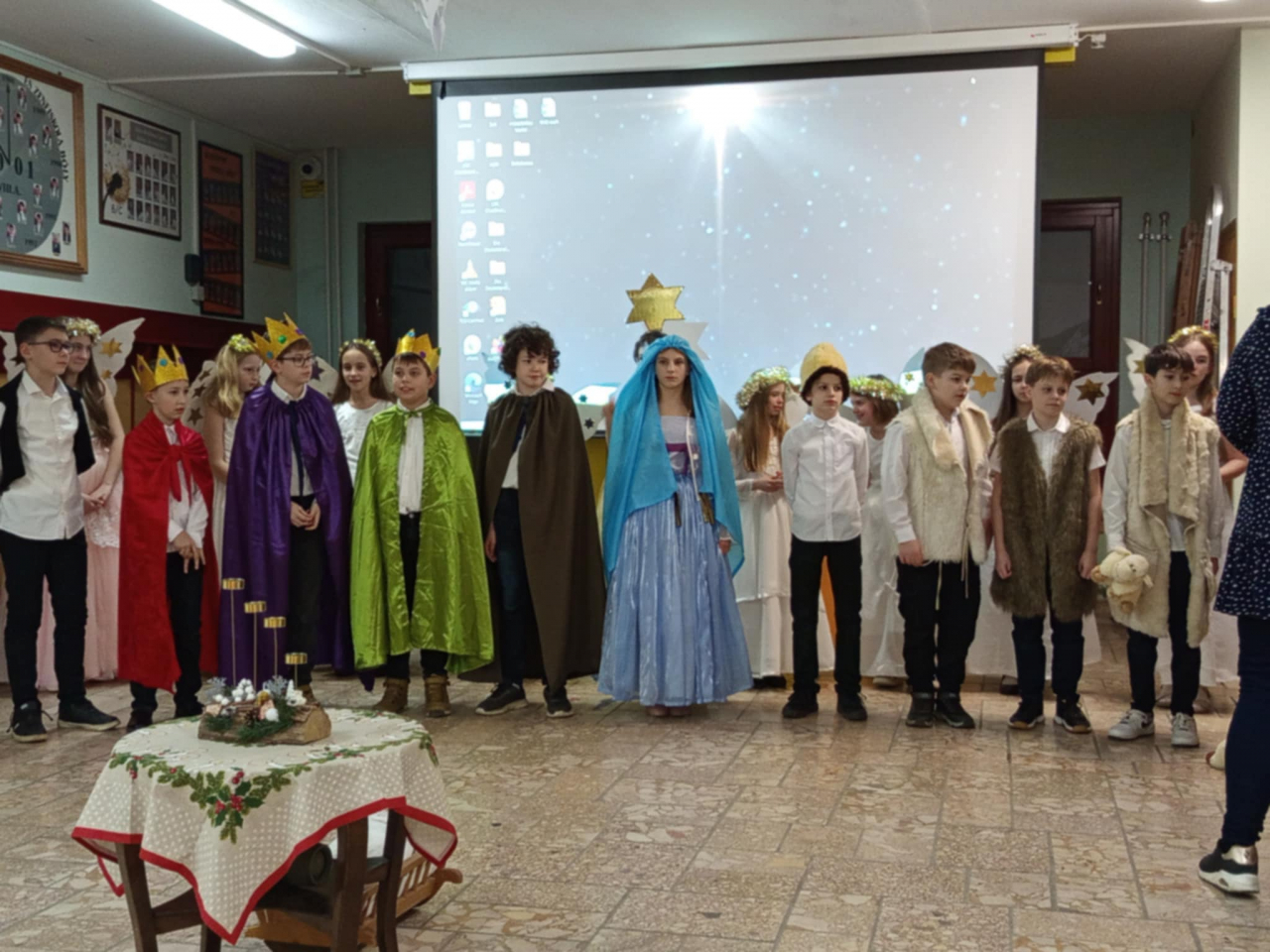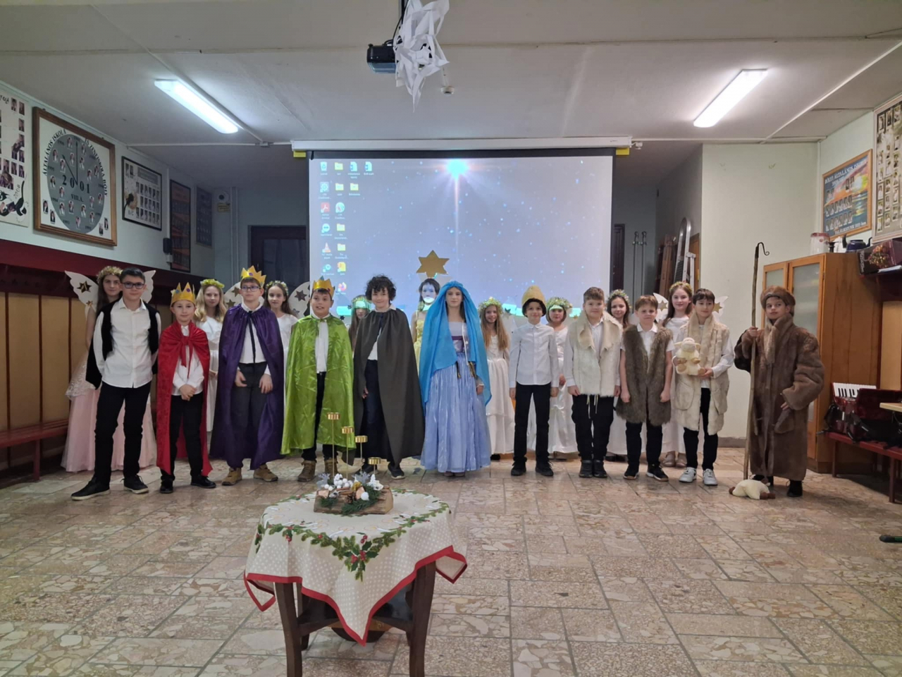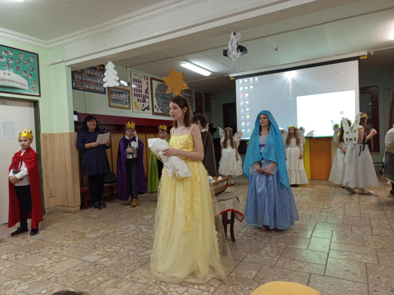 5.c1 osztály karácsonyi hangolódás címmel betlehemes színdarabot adott elő a gyerekek családjainak, majd együtt társasoztak, beszélgettek.