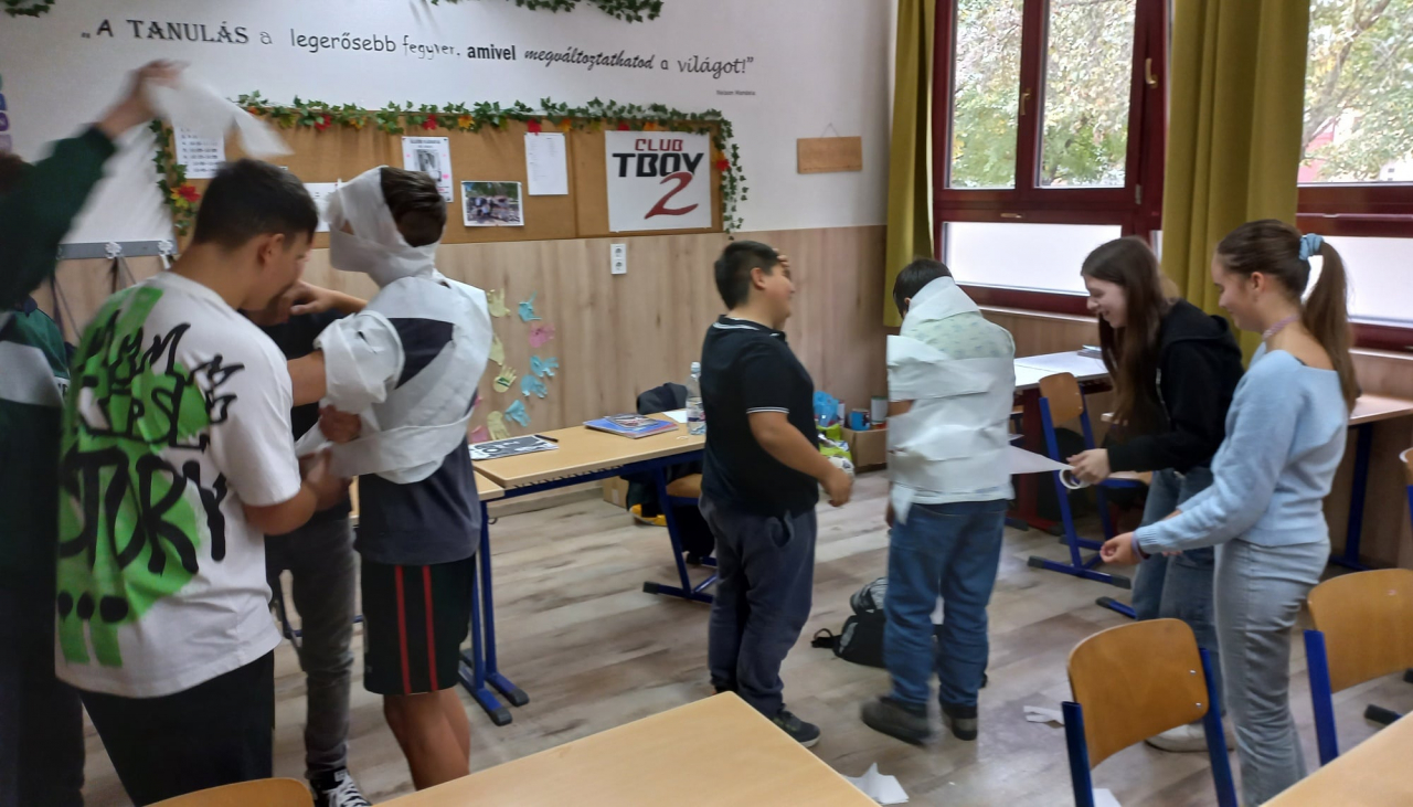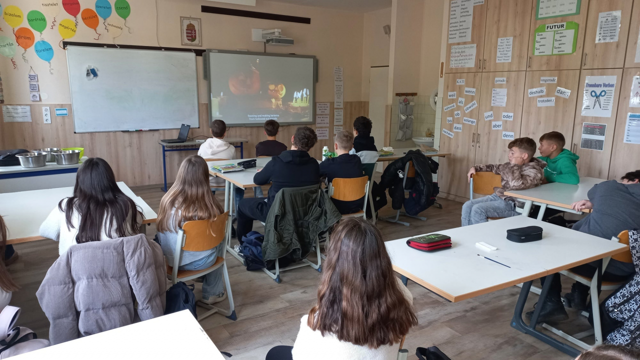 2025. október 15-e és 21-e között a 7. és 8. évfolyamos tanulóinknak angol projekt órát tartottunk Halloween témában. Az ősi kelta hagyományokból kialakult ünnep történetének bemutatását követően a diákok játékos versenyfeladatokat oldottak meg. A vidám hangulatú órán a gyermekek kipróbálhatták a régi Halloween szokások közé tartozó almahalászatot. Ezen kívül vicces múmiakészítő, labirintus, valamint szókereső feladatban remekeltek.