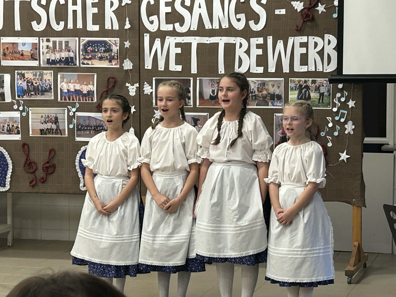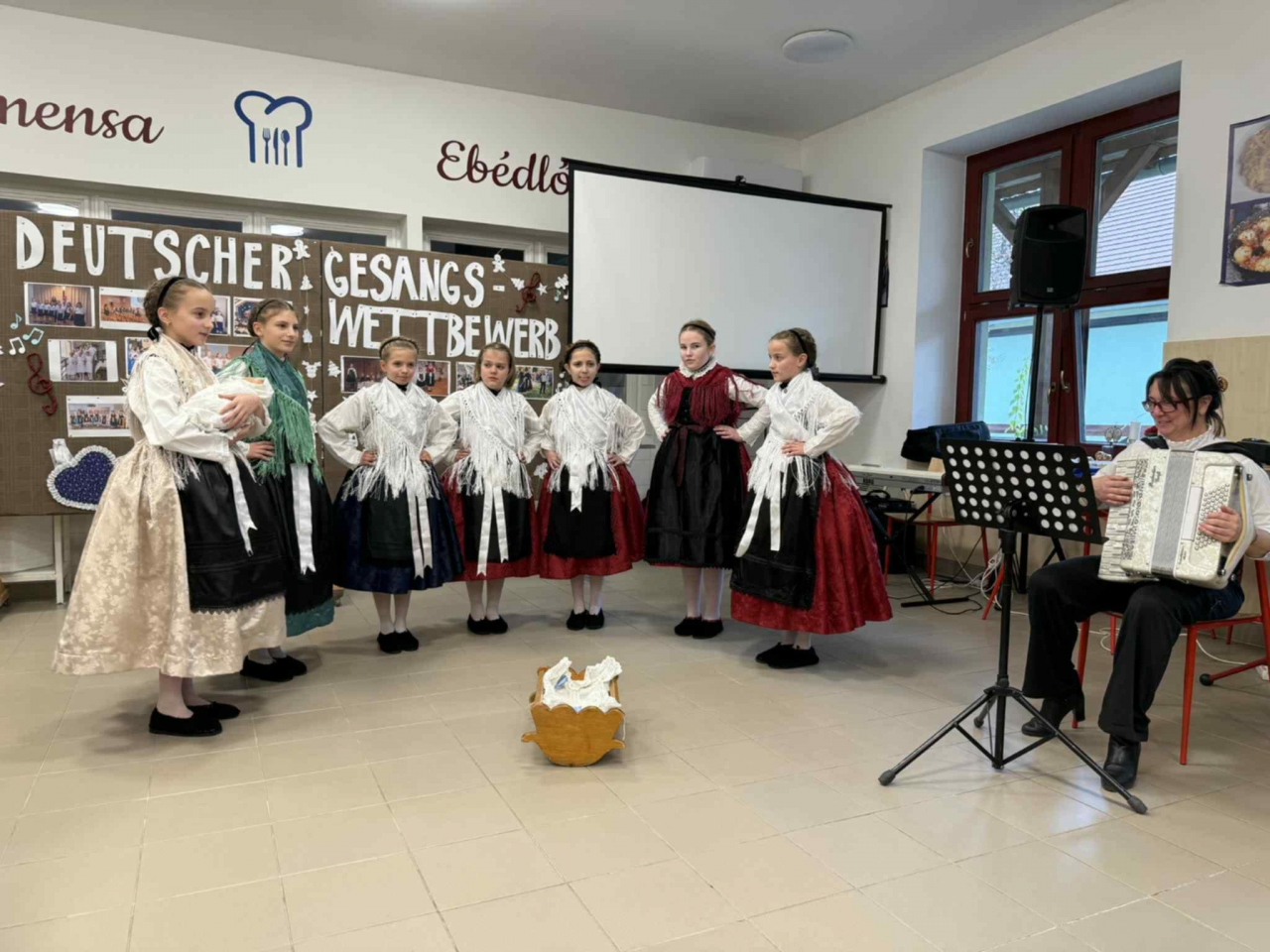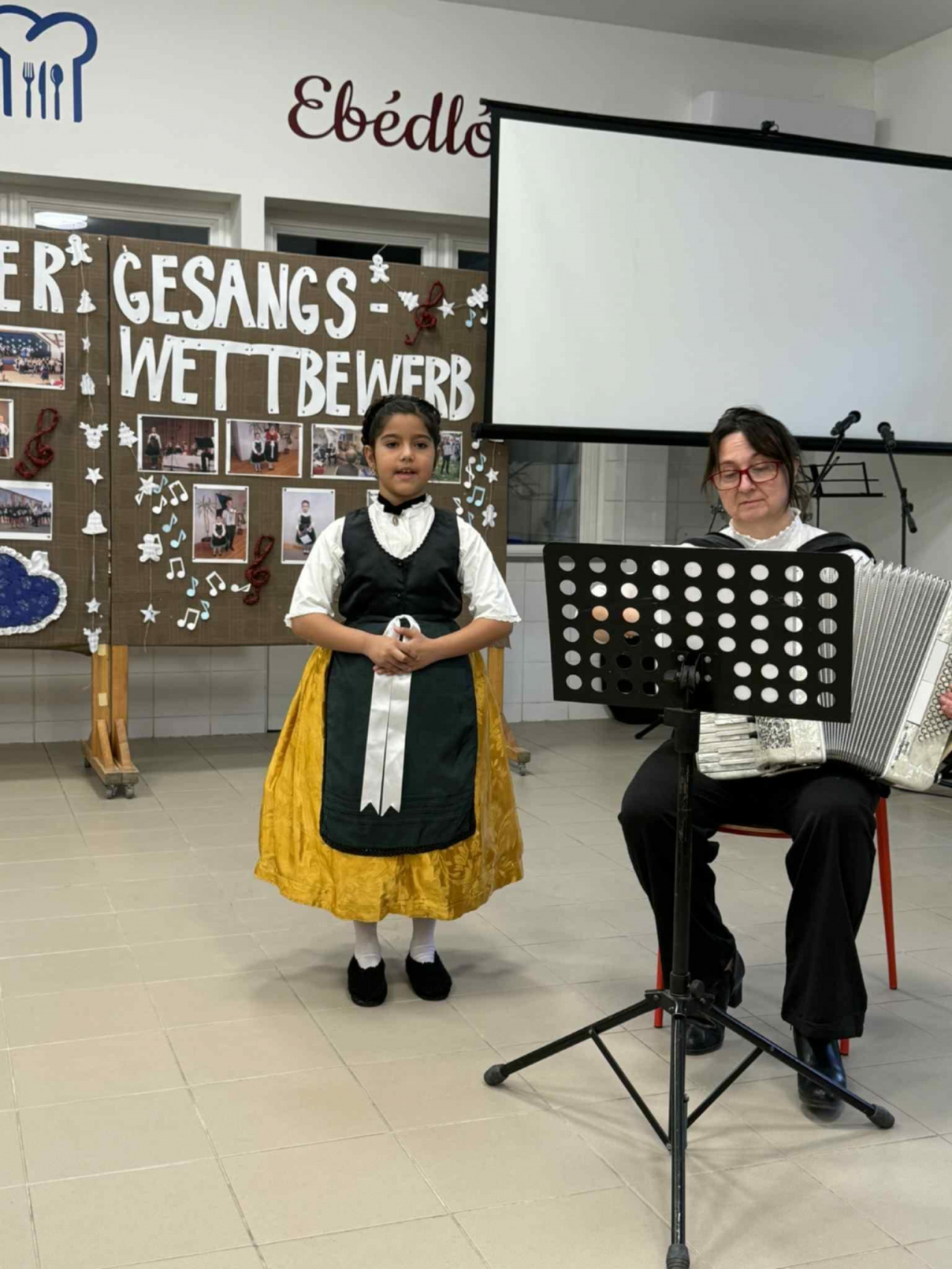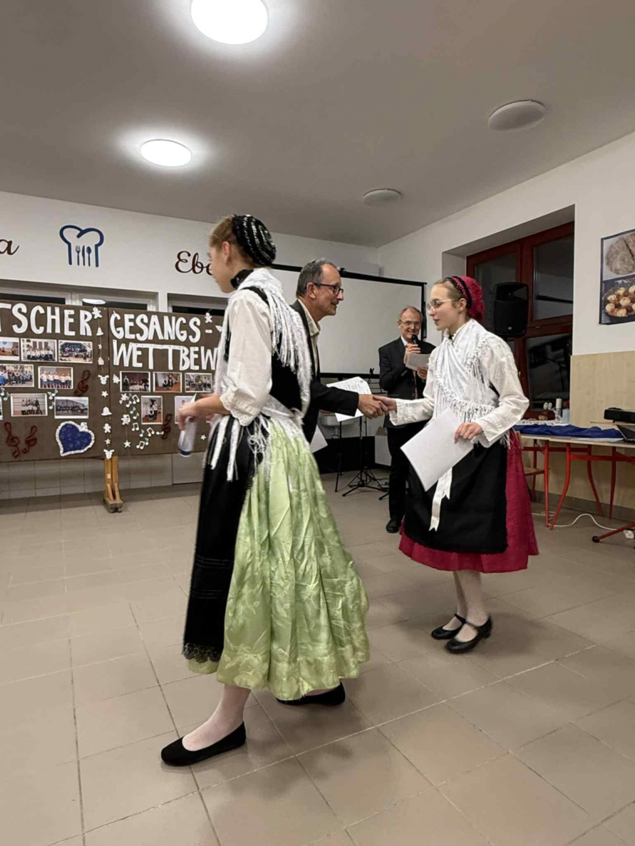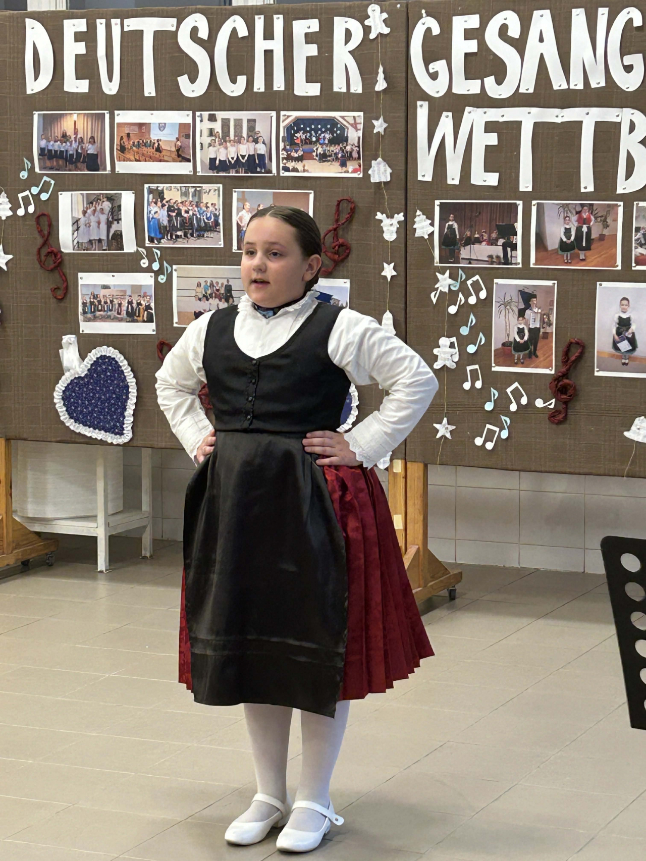 Auch die Schülerinnen unserer Schule präsentierten sich im Wettbewerb – als Solistinnen, im Duett und im kleinen Chor. Die Jury beriet lange nach den Auftritten, denn sowohl unsere Schülerinnen als auch die Schülerinnen der teilnehmenden Schulen zeigten hervorragende Leistungen. Es war wunderbar zu sehen, dass die Hände zwar vor dem Wettbewerb schweißnass waren, die Sänger*innen aber während des Auftritts mit funkelnden Augen, lächelnd und selbstbewusst in Tracht vor dem Publikum standen.
