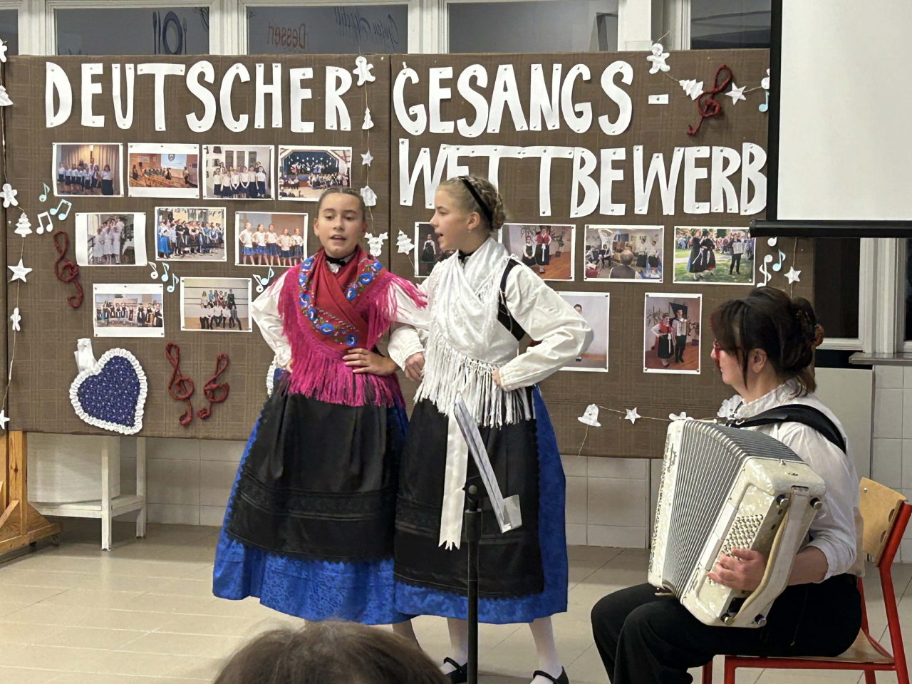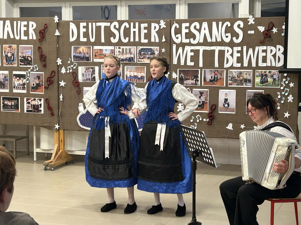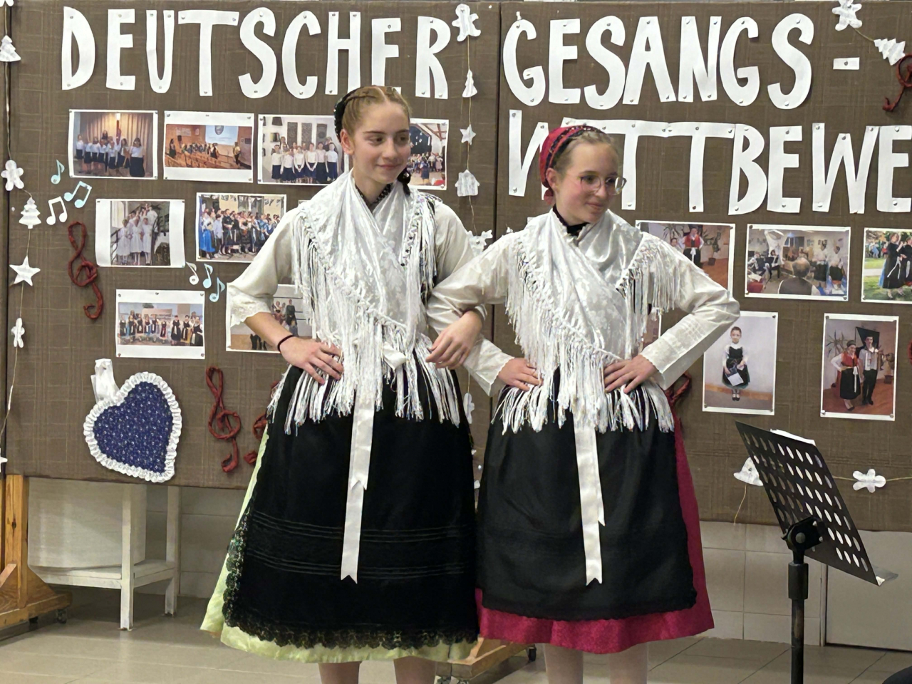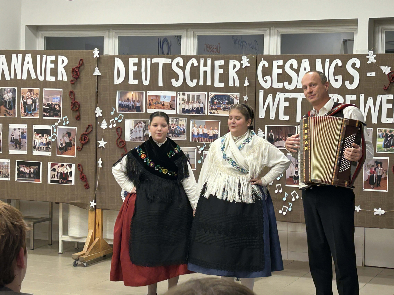 Auch die Schülerinnen unserer Schule präsentierten sich im Wettbewerb – als Solistinnen, im Duett und im kleinen Chor. Die Jury beriet lange nach den Auftritten, denn sowohl unsere Schülerinnen als auch die Schülerinnen der teilnehmenden Schulen zeigten hervorragende Leistungen. Es war wunderbar zu sehen, dass die Hände zwar vor dem Wettbewerb schweißnass waren, die Sänger*innen aber während des Auftritts mit funkelnden Augen, lächelnd und selbstbewusst in Tracht vor dem Publikum standen.