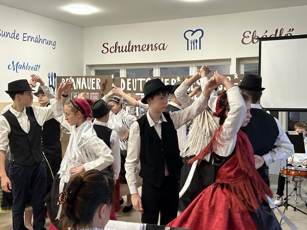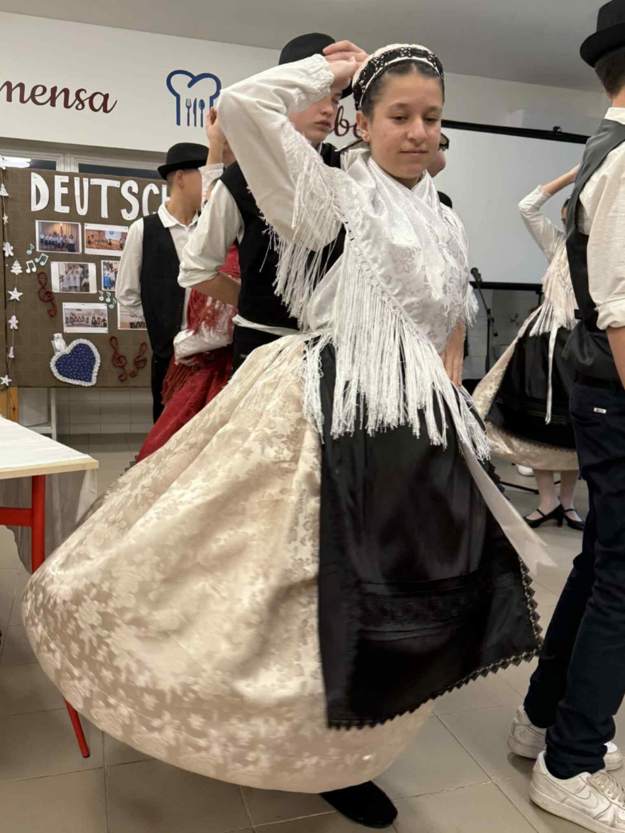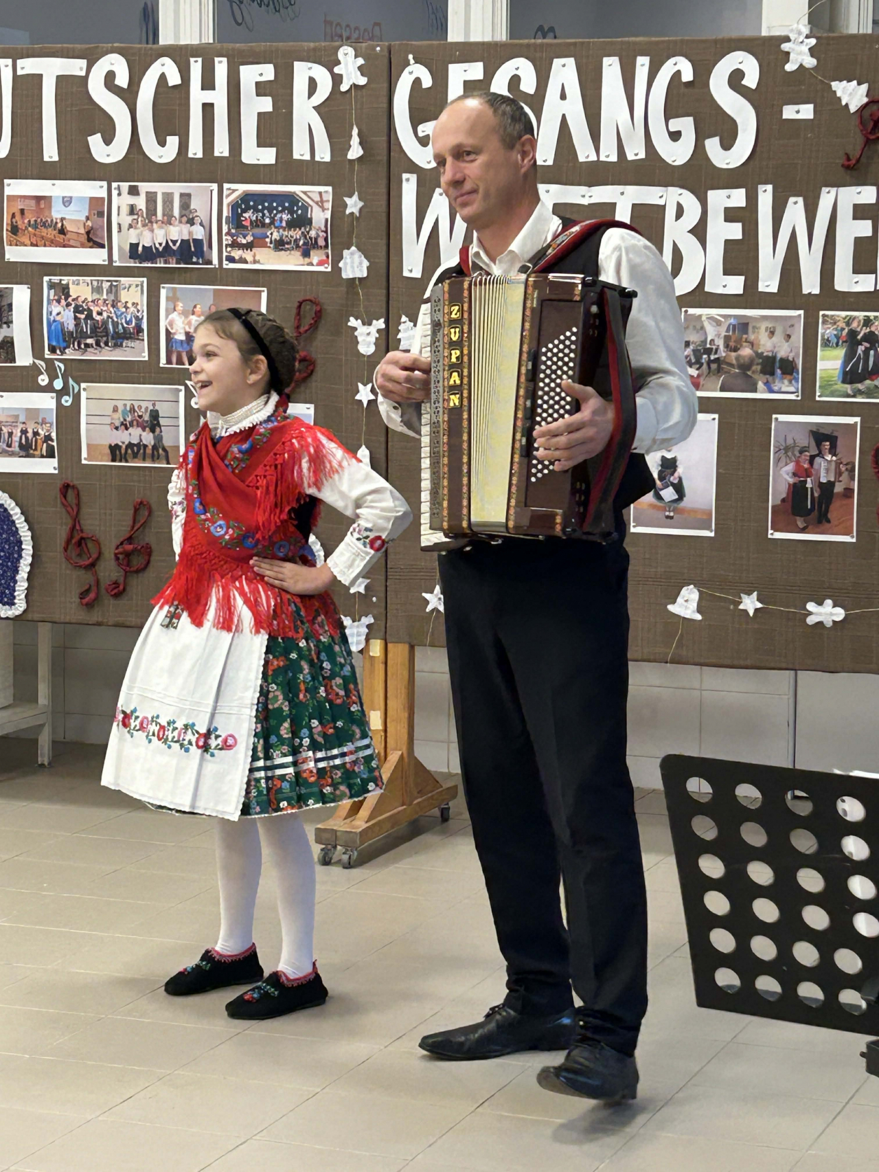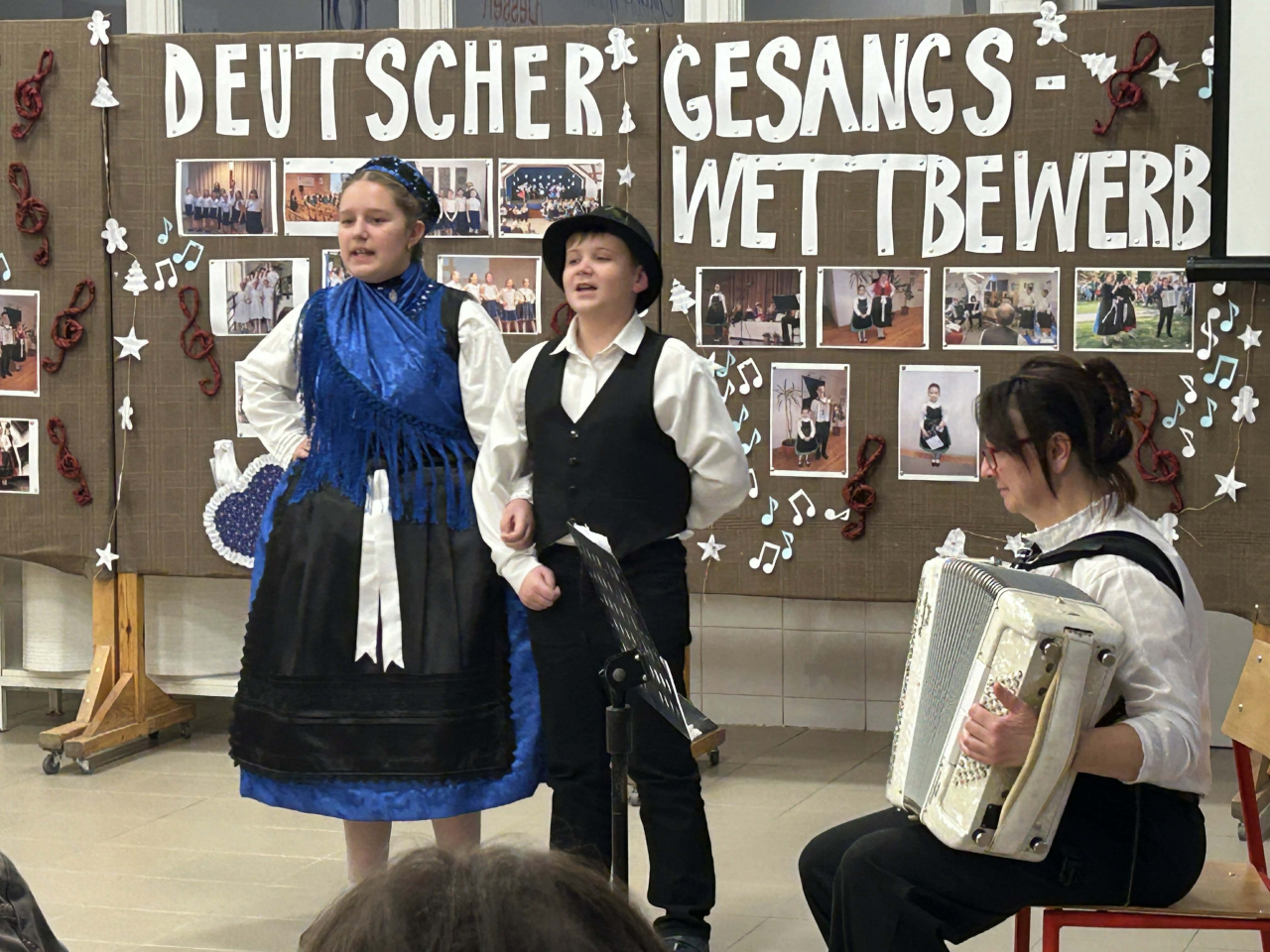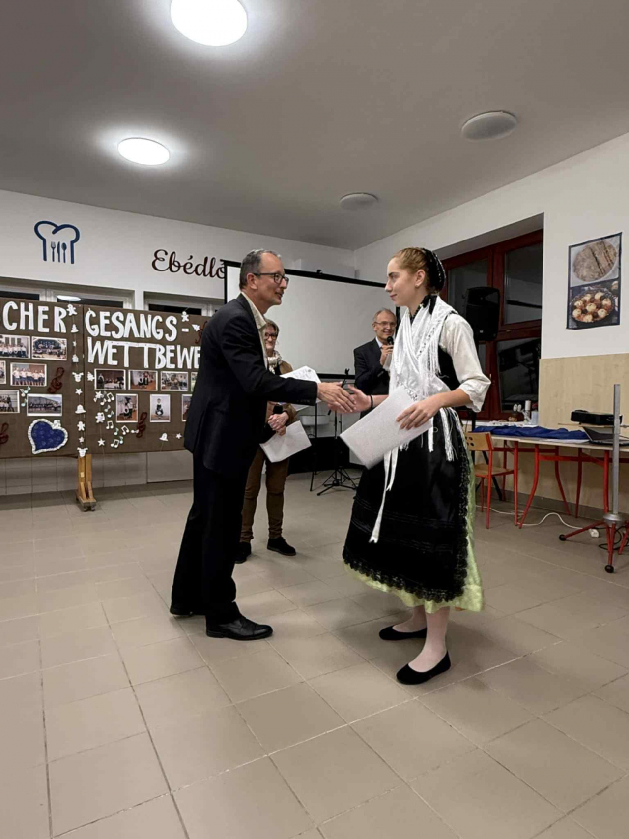 Auch die Schülerinnen unserer Schule präsentierten sich im Wettbewerb – als Solistinnen, im Duett und im kleinen Chor. Die Jury beriet lange nach den Auftritten, denn sowohl unsere Schülerinnen als auch die Schülerinnen der teilnehmenden Schulen zeigten hervorragende Leistungen. Es war wunderbar zu sehen, dass die Hände zwar vor dem Wettbewerb schweißnass waren, die Sänger*innen aber während des Auftritts mit funkelnden Augen, lächelnd und selbstbewusst in Tracht vor dem Publikum standen.
