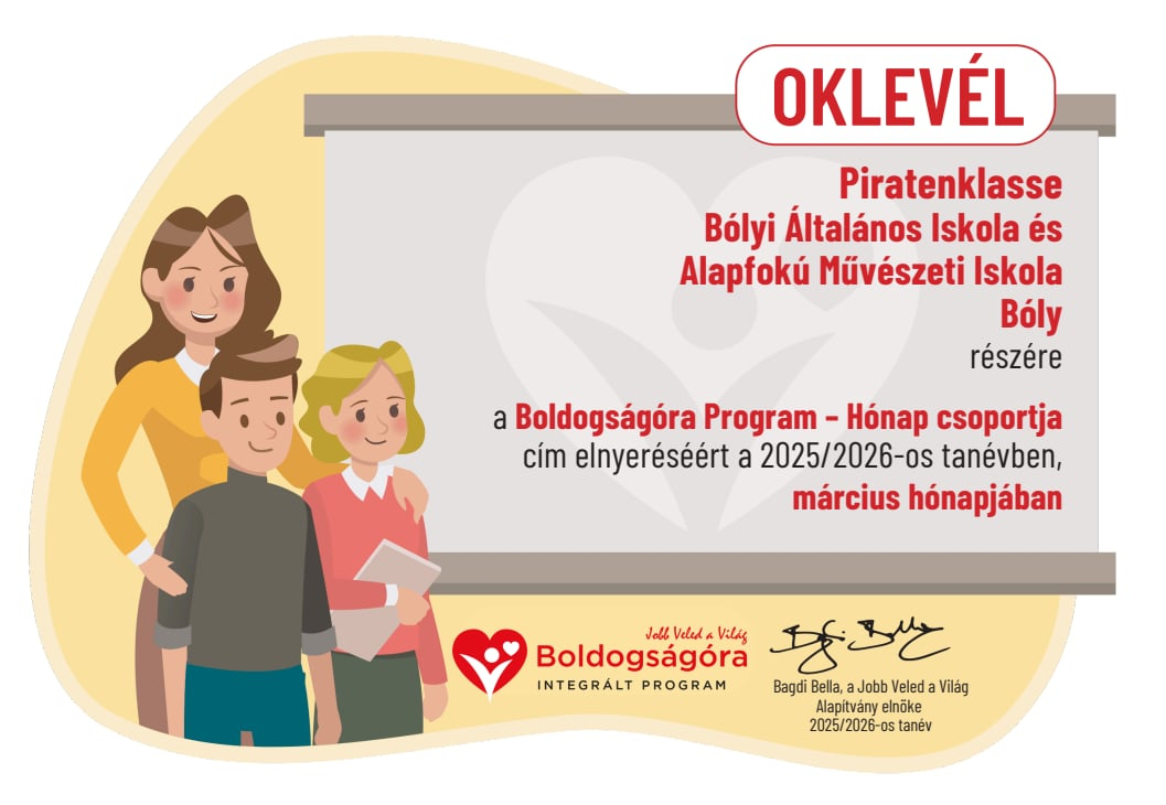 Iskolánk 3. c osztálya a Boldogságóra Program – Hónap csoportja cím elnyeréséért a "Márciusi apró örömök" tevékenységeivel a 2025/2026-os tanévben, március hónapjában a Boldogságóra program keretében elnyerte a hónap csoportja címet . Gratulálunk az elismeréshez!