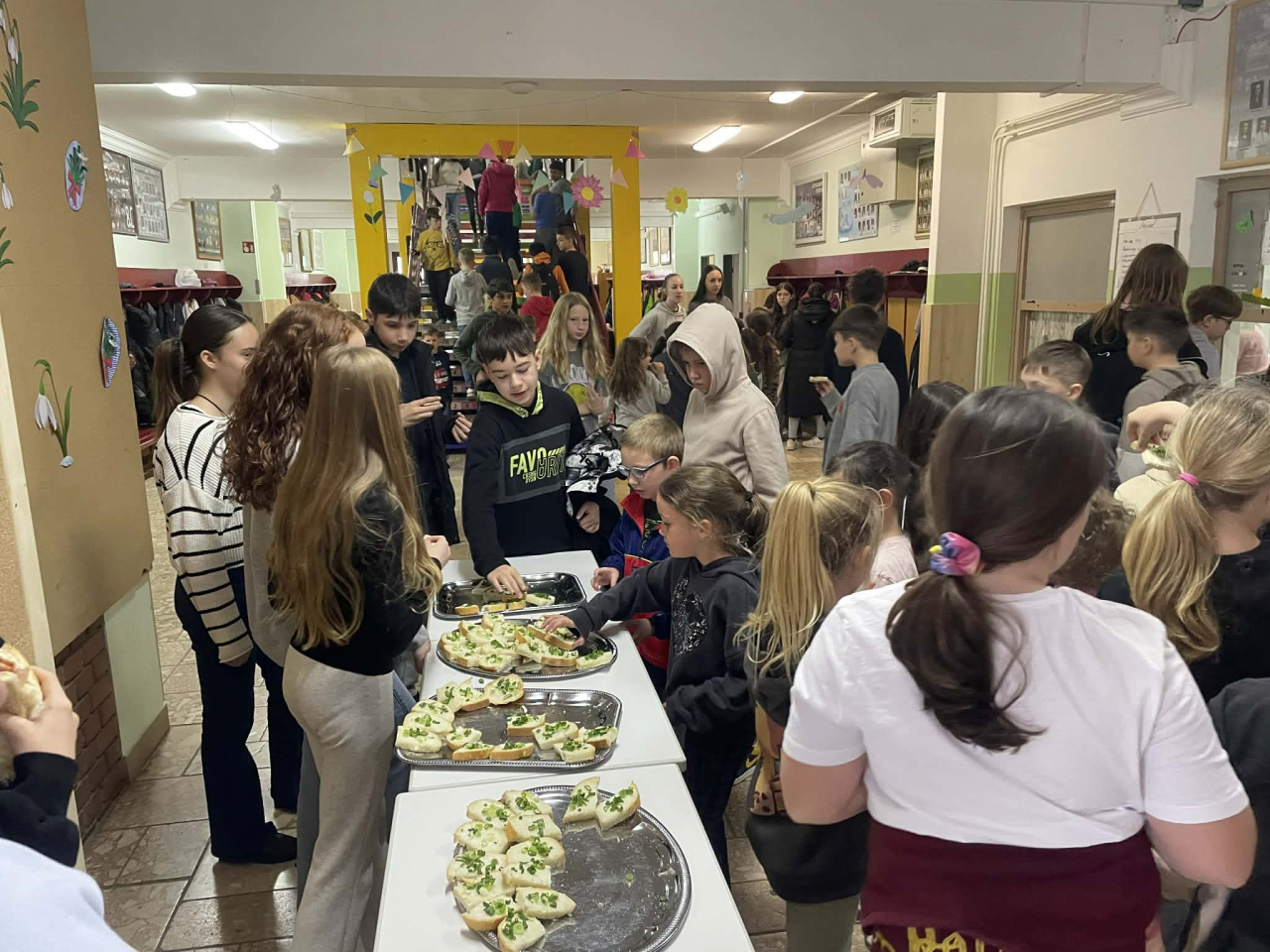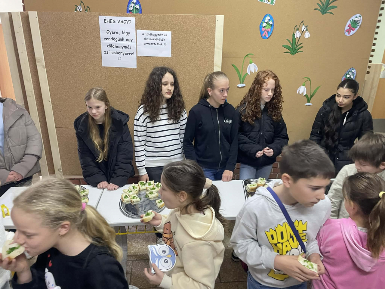 A délelőtt folyamán ökoszakkörös tanulóink, saját termesztésű zöldhagymával szórt, zsíros kenyérrel vendégelték meg tanulóinkat.